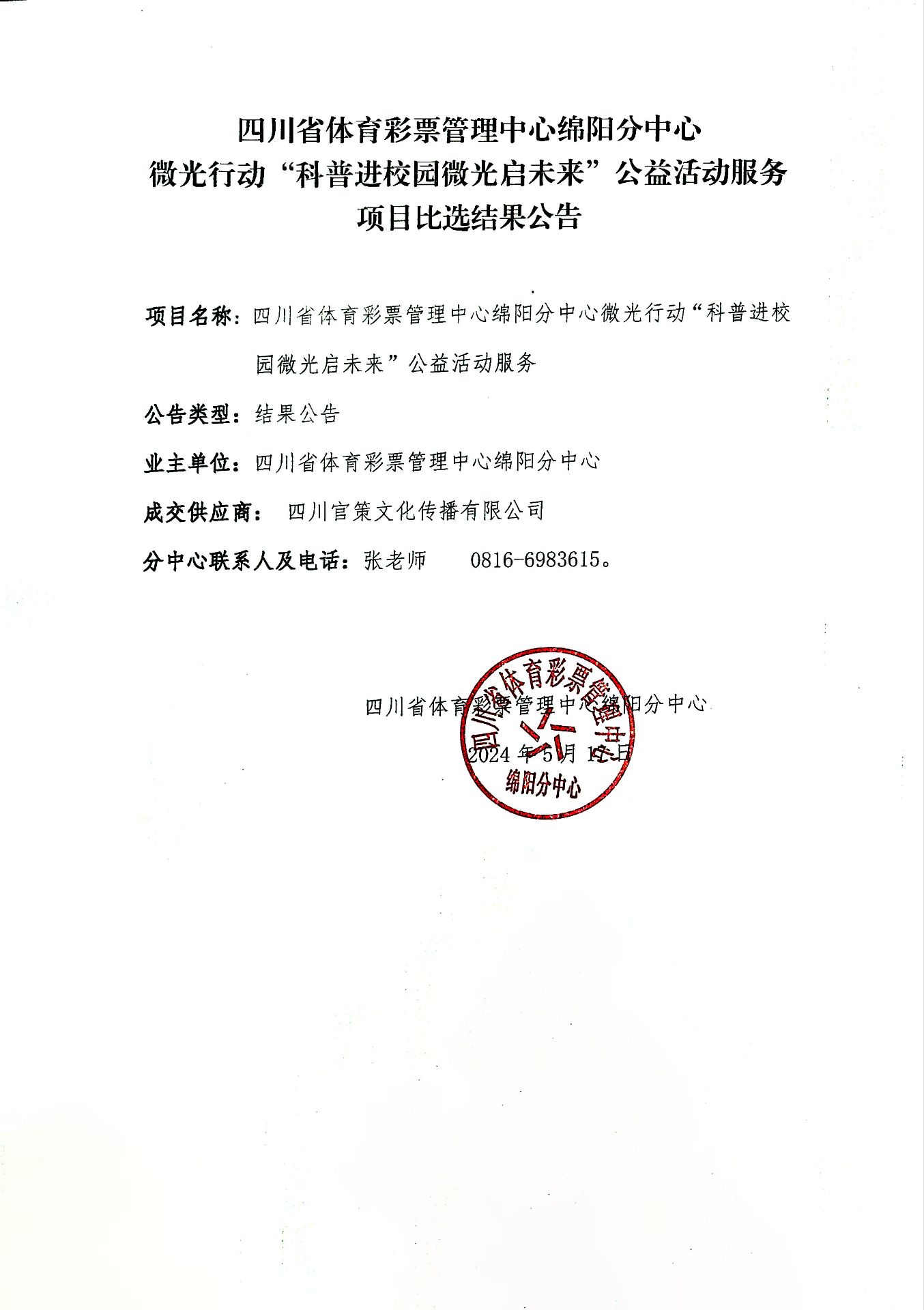 四川省體育彩票管理中心綿陽(yáng)分中心微光行動(dòng)“科普進(jìn)校園微光啟未來(lái)”公益活動(dòng)服務(wù)項(xiàng)日比選結(jié)果公告