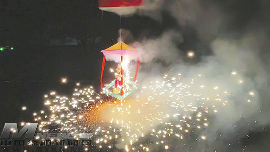 隨著鞭炮的爆炸聲,煙火架底部的煙花馬上呈飛碟般旋轉(zhuǎn)噴發(fā),而此時,煙火架里的焰火也跟著亮了,“八仙過海”等造型各異的戲劇傳說人物也隨架子旋轉(zhuǎn)飛舞起來,動感強(qiáng)烈,場面蔚為壯觀。層層煙火伴隨著戲劇人物、對聯(lián)、圖案等漸次燃燒,璀璨夜空,煞是好看。