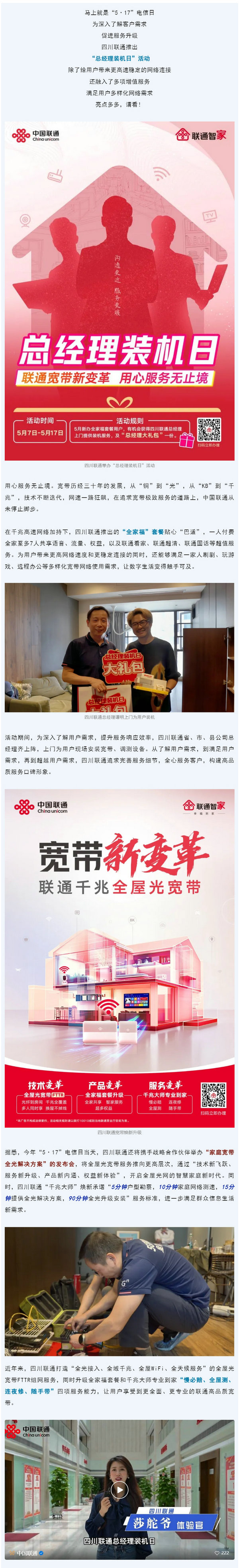 馬上就是“5·17”電信日,為深入了解客戶需求促進(jìn)服務(wù)升級(jí),四川聯(lián)通推出“總經(jīng)理裝機(jī)日”活動(dòng)。