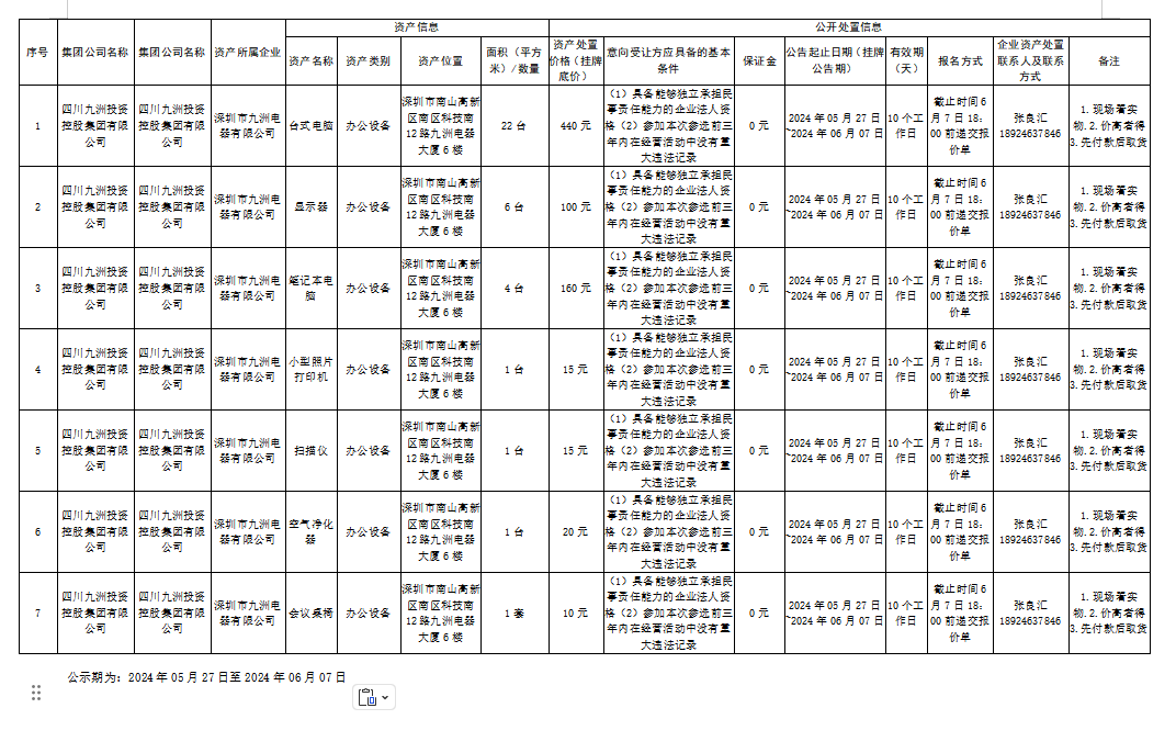 深圳市九洲電器有限公司資產(chǎn)處置公告