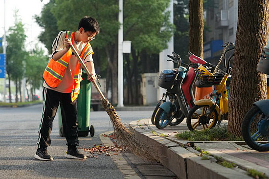 清掃路面的少年今年15歲,名叫周奕唯,是常德外國語學(xué)校的初二學(xué)生。2023年3月,在物業(yè)公司工作的媽媽李春梅開始在上午上班前兼職做環(huán)衛(wèi)工作補貼家用。媽媽手持掃把清掃路面的身影被周奕唯看在眼里,他提出要幫助媽媽清掃路面,減輕媽媽的負擔(dān)。整個暑假,周奕唯堅持和媽媽一起在街頭清掃。暑假過后,爸爸周武也加入了幫忙隊伍——爸爸承包工作日,兒子承包休息日,父子倆接力幫助媽媽完成清掃工作。