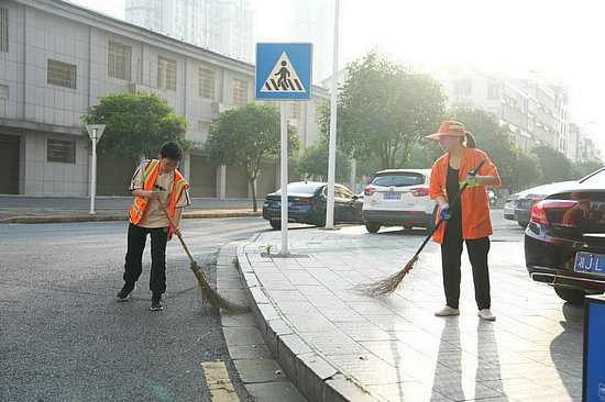 5月25日,周奕唯(左)和媽媽在常德市芙蓉路上清掃路面。