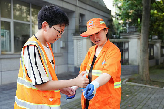 5月25日,周奕唯(左)在清掃馬路前幫媽媽噴防蚊藥。