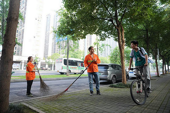 5月24日,周奕唯(右)騎車上學(xué)經(jīng)過芙蓉路時和爸爸、媽媽打招呼。工作日,爸爸會幫助媽媽掃馬路,到了周末,則由周奕唯幫忙。