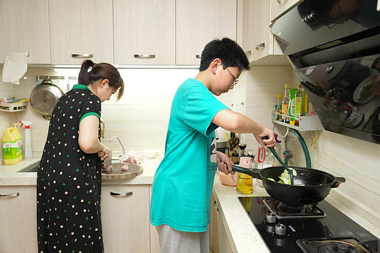 5月24日傍晚,周奕唯(右)在家中幫助媽媽做飯。