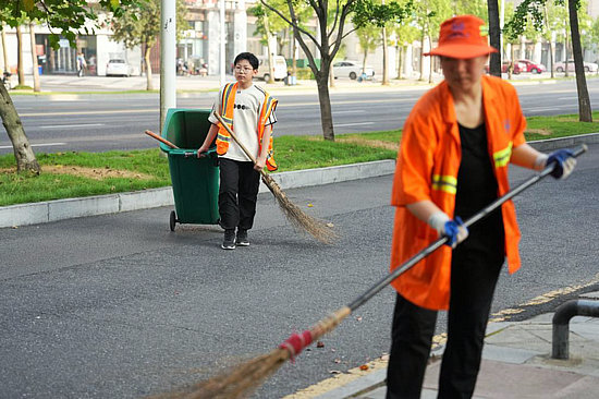 5月25日,周奕唯(右)和表弟周念純在常德市芙蓉路上清掃路面。表弟得知周奕唯的故事后也來幫忙清掃道路。