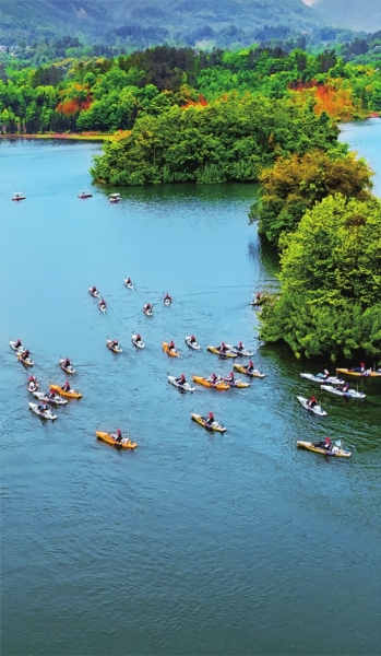 位于雎水鎮(zhèn)的人間瑤池白水湖,湖中有大小島嶼23個,星羅棋布,像寶石一樣鑲嵌在清澈的碧波之上。建筑與自然完美融合的白水湖游客中心、多元業(yè)態(tài)集合的空間觀湖小館、臨水開放的沙汀書屋,看書、喝茶、餐飲、聊天、小憩……