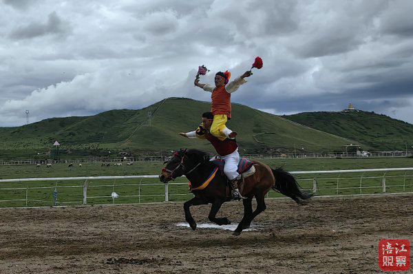 紅原是中國“馬術(shù)之鄉(xiāng)”,紅原賽馬歷史悠久,紅原馬術(shù)是省級非遺項(xiàng)目。當(dāng)天下午,紅原賽馬場正在舉行賽馬表演,紅原的漢子們飛馬而行,站在馬背上向游客敬獻(xiàn)哈達(dá)、致禮獻(xiàn)花,隨后他們不斷策馬往返,表演馬背橫撐、鐙里藏身、飛馬倒立、馬背轉(zhuǎn)體180度、雙鷹展翅、我心飛翔等驚險(xiǎn)動作,看得游客尖叫聲不斷,有的游客還提醒騎手們“小心”。