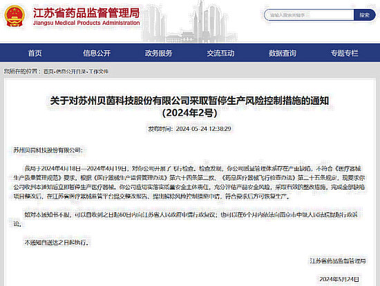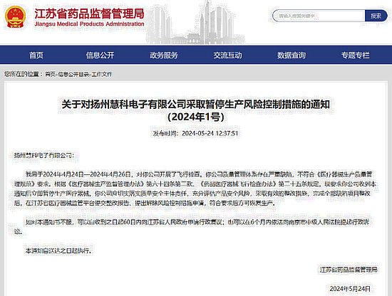 通知中稱,2024年4月18日—19日,江蘇省藥品監(jiān)督管理局對揚州慧科和蘇州貝茵開展飛行檢查發(fā)現(xiàn),上述兩家公司質(zhì)量管理體系不符合《醫(yī)療器械生產(chǎn)質(zhì)量管理規(guī)范》要求。