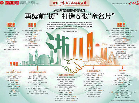 浙川對(duì)口幫扶自1996年開(kāi)始,今年邁進(jìn)第28?jìng)€(gè)年頭。根據(jù)中央統(tǒng)一部署,2021年6月,新一輪浙川東西部協(xié)作啟動(dòng)。3年時(shí)間,立足“浙江所能,四川所需”,在產(chǎn)業(yè)協(xié)作、數(shù)字化轉(zhuǎn)型、消費(fèi)幫扶、文化交流和援派鐵軍5個(gè)方面,浙川兩省打造了5張“金名片”。回望來(lái)路,讓我們從一組組數(shù)據(jù)透視浙川協(xié)作新成效。