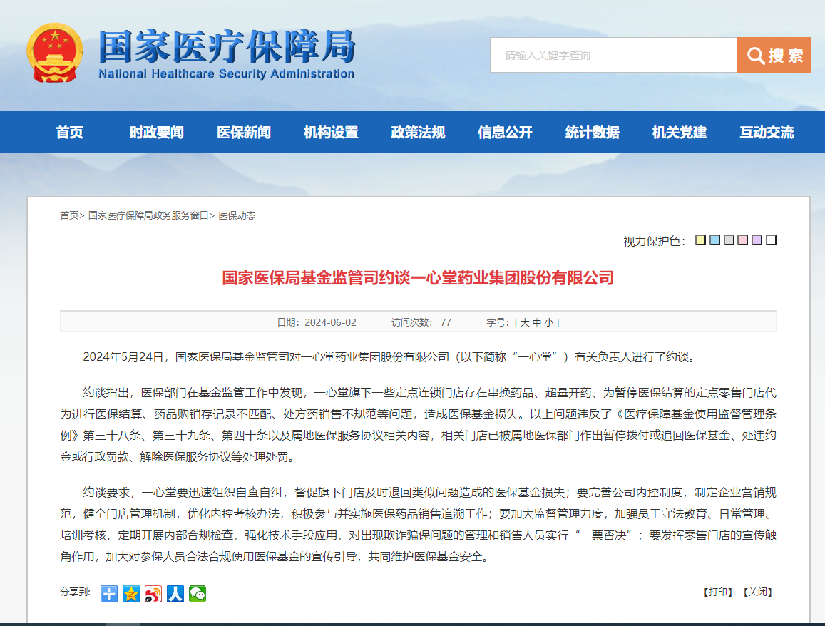 近日,國家醫(yī)保局基金監(jiān)管司對一心堂藥業(yè)集團(tuán)股份有限公司(以下簡稱“一心堂”)有關(guān)負(fù)責(zé)人進(jìn)行了約談。