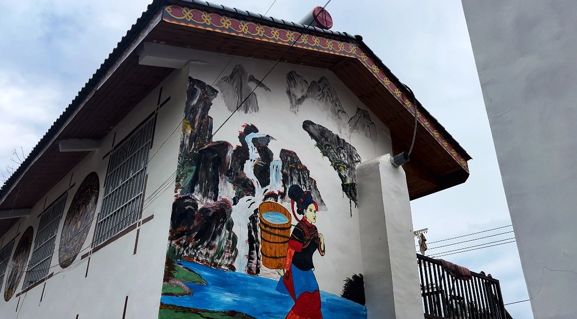 離開陳列館,阿達(dá)牛色帶記者來到他現(xiàn)在的家,兩層的新房,樓上是臥室,樓下是客廳和廚房等。客廳的電視墻上,是一幅阿布洛哈村的山水畫。巍峨的山峰、幽深的峽谷、映上遠(yuǎn)處的藍(lán)天,正是他心中最美的樣子。