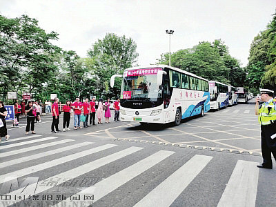 ?。对拢度障挛纾d陽(yáng)高考考生紛紛前往考點(diǎn)學(xué)校,熟悉考場(chǎng)環(huán)境。