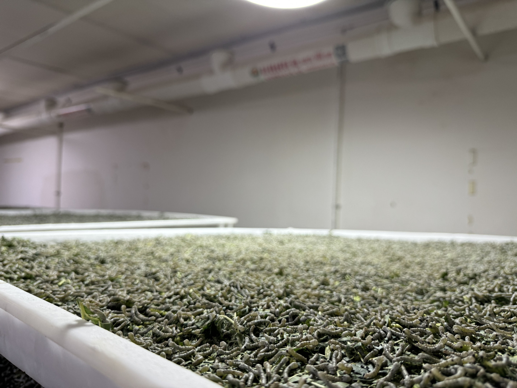 小蠶共育車間內(nèi),正在吃桑葉的蠶寶寶。