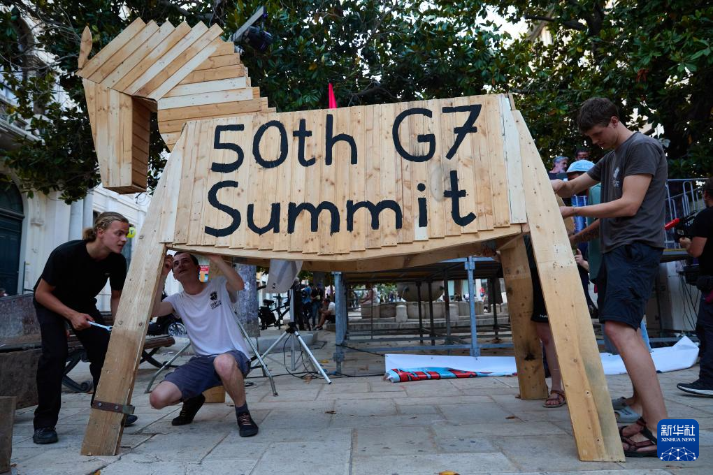 6月13日,在距七國(guó)集團(tuán)峰會(huì)會(huì)場(chǎng)60公里的意大利布林迪西市,抗議者制作“特洛伊木馬”諷刺并抗議七國(guó)集團(tuán)峰會(huì)。新華社記者 孟鼎博 攝