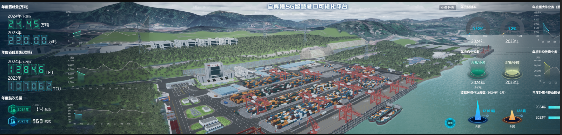 這是四川首個5G智慧港口項目——宜賓港5G智慧港口一期工程。工程一標(biāo)段建成了港口集裝箱作業(yè)管理系統(tǒng)、集裝箱智能閘口系統(tǒng)、港口業(yè)務(wù)大數(shù)據(jù)可視化系統(tǒng)3套智能系統(tǒng),顯著降低人力成本,港口作業(yè)效率提高30%;二標(biāo)段于去年12月完成驗收,預(yù)計每年可減少碳排放約2.4噸。