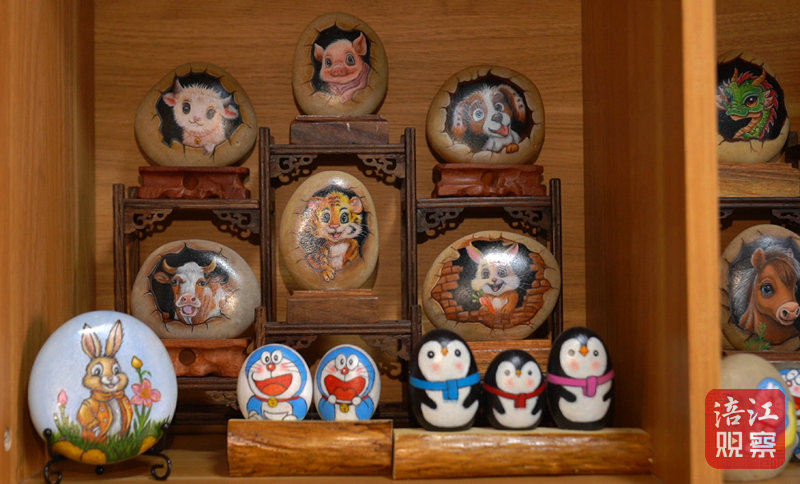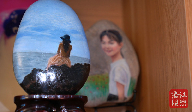 張霞自幼愛好繪畫。6年前一次郊游,她在河灘拾得幾枚形態(tài)好看的石頭回家。閑暇中,張霞把玩這些石頭,靈感油然而生:“何不在石頭上繪畫呢?”