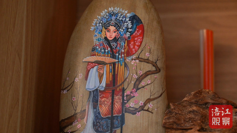 走進(jìn)張霞石藝工作室,環(huán)壁的櫥架上,風(fēng)光旖旎的山水、嬌艷無比的花草、雍容華麗的戲劇扮相、呆萌可愛的熊貓……從擺件到掛件、從吊墜到居家器物,石畫緣自形態(tài)各異的石頭,生動(dòng)而細(xì)膩的繪畫功底令人驚嘆。