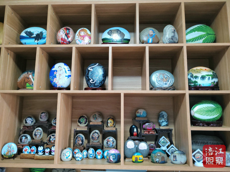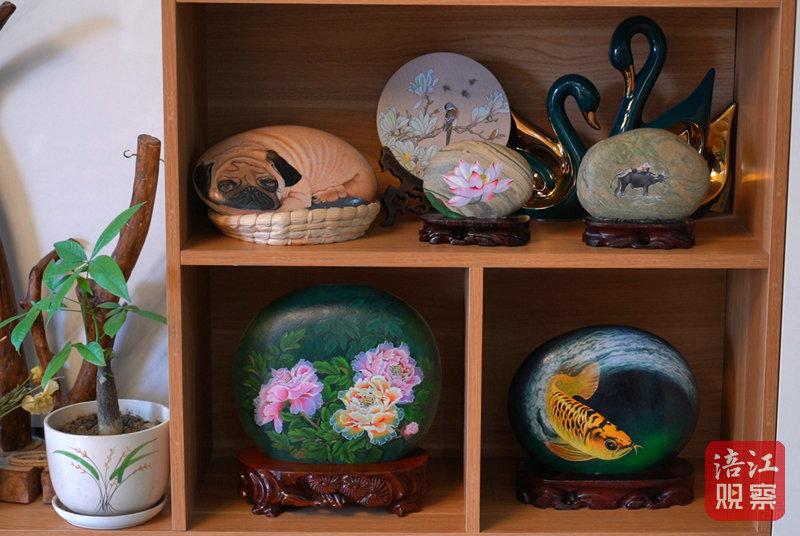 這些多姿多彩的石畫出自張霞的纖纖玉手,真正應(yīng)驗(yàn)了“巧手繪出真善美,頑石也能開奇花。”