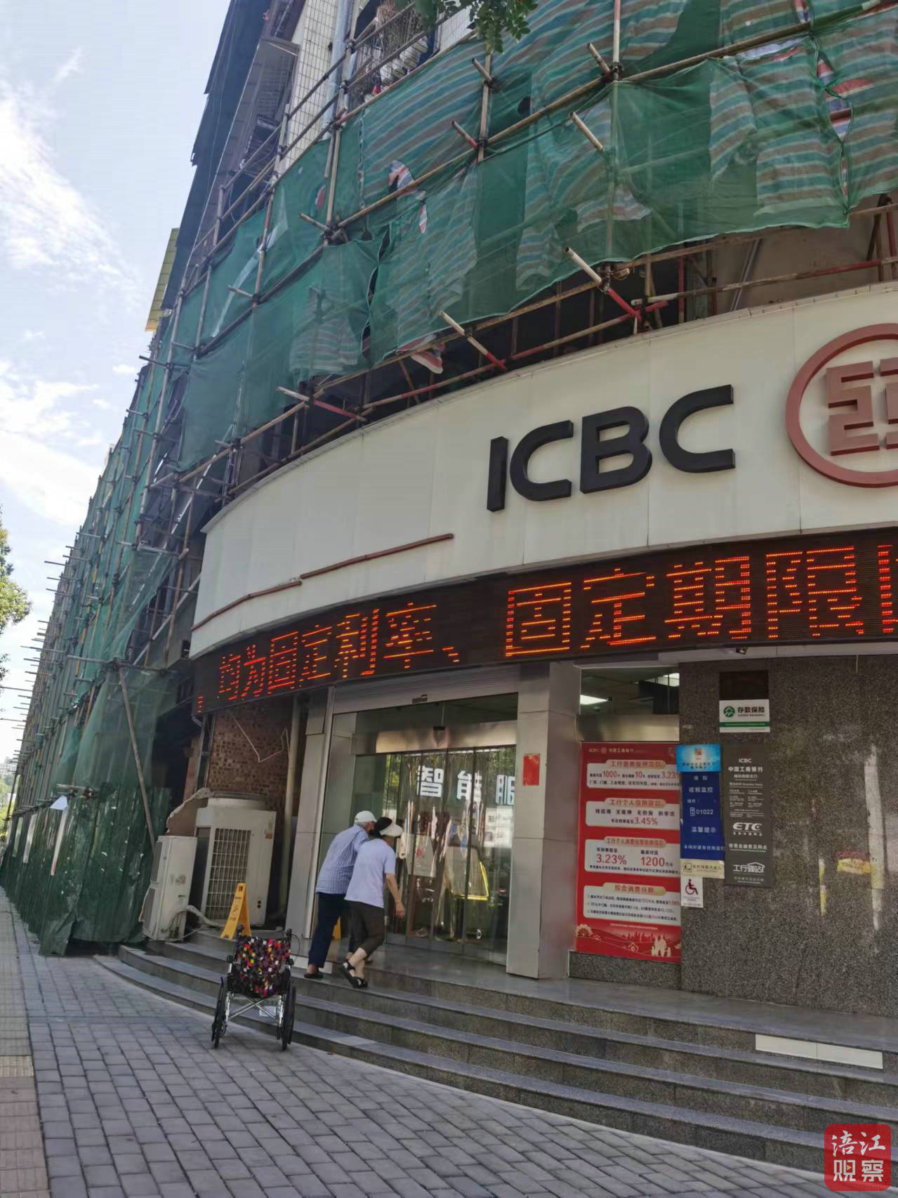 “你看,這里二樓看似安裝了防護網(wǎng),但下面是‘鏤空’的,整個安全防護網(wǎng)不是形同虛設(shè)嗎?”順著市民的手指看過去,只見南河體運村路8號附6號工商銀行營業(yè)廳上方,正是鄧氏酒樓二樓的裝修工地,防護網(wǎng)整體破舊不堪,而且下部臨街的防護網(wǎng)還呈“鏤空”狀態(tài),完全未采取任何防護措施,形同虛設(shè)。下面有不少過路群眾和到銀行辦理業(yè)務(wù)的市民經(jīng)過,存在明顯的安全隱患。