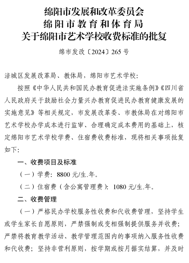 綿陽(yáng)市發(fā)展和改革委員會(huì)綿陽(yáng)市教育和體育局關(guān)于綿陽(yáng)市藝術(shù)學(xué)校收費(fèi)標(biāo)準(zhǔn)的批復(fù)