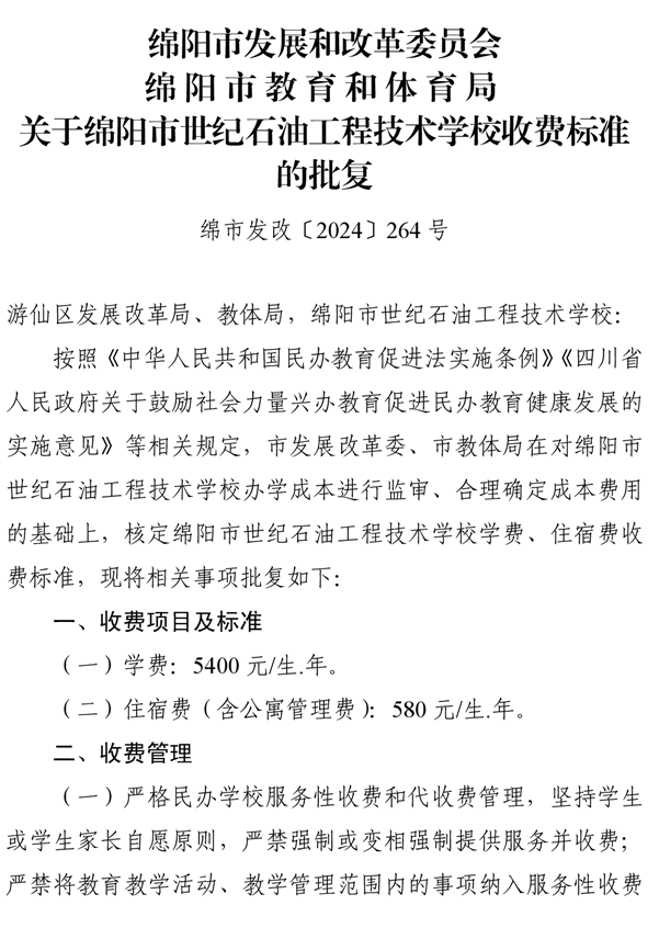 綿陽市發(fā)展和改革委員會綿陽市教育和體育局關(guān)于綿陽市世紀(jì)石油工程技術(shù)學(xué)校收費標(biāo)準(zhǔn)的批復(fù)