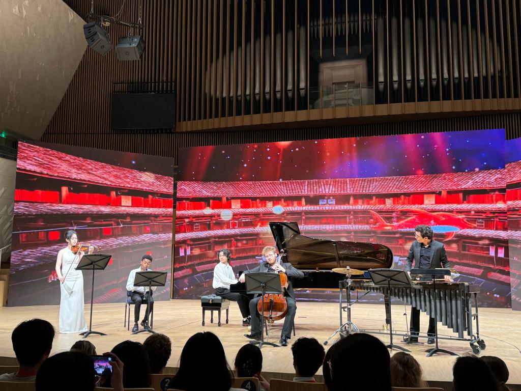 “接下來(lái)這首曲子,是我們將西方古典樂(lè)與東方美學(xué)相結(jié)合的一次嘗試。希望中美文化交流一直持續(xù),并越來(lái)越好。”在現(xiàn)場(chǎng)熱烈的歡呼聲中,中國(guó)青年鋼琴家阮揚(yáng)揚(yáng)與其他4位同樣來(lái)自美國(guó)柯蒂斯音樂(lè)學(xué)院的學(xué)生一起,為觀眾獻(xiàn)上管弦五重奏《大魚(yú)》和《茉莉花》。