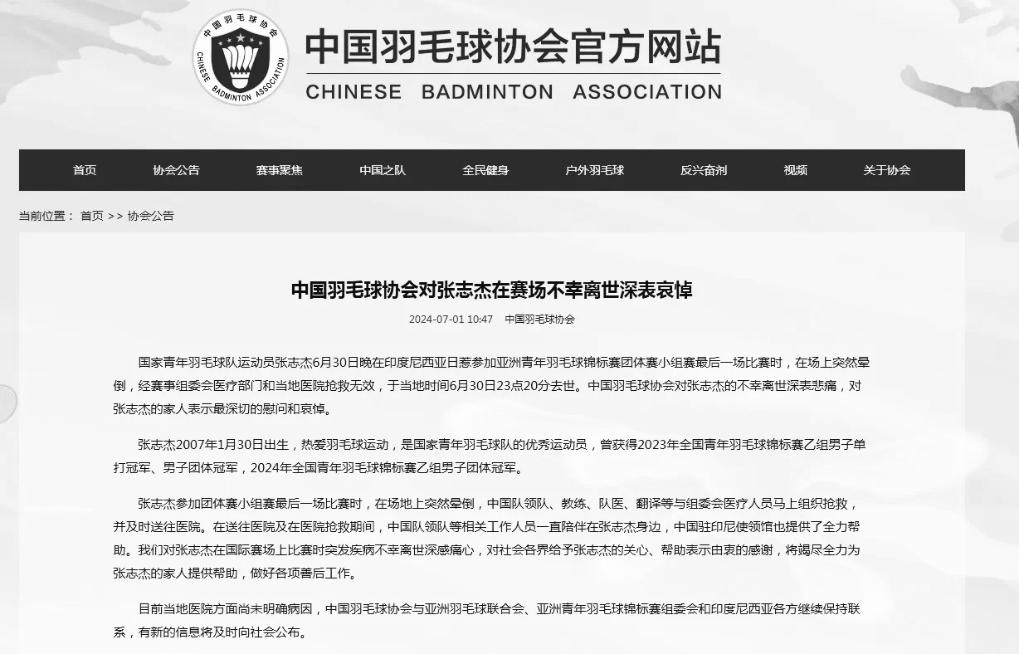 “我們對(duì)張志杰在國際賽場上比賽時(shí)突發(fā)疾病不幸離世深感痛心,對(duì)社會(huì)各界給予張志杰的關(guān)心、幫助表示由衷的感謝,將竭盡全力為張志杰的家人提供幫助,做好各項(xiàng)善后工作。”中國羽協(xié)在公告中寫道。