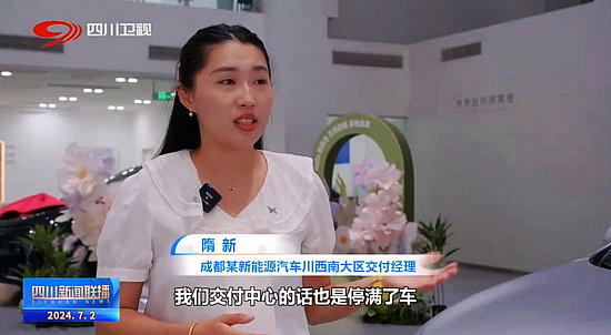 成都某新能源汽車川西南大區(qū)交付經理 隋新:大概有個20%左右的這樣的一個增幅,我們交付中心的話也是停滿了車,然后這個只是今天上午的,下午還會再有一批車進來,今天大概有個20多臺的一個交付量,也是本月的最高峰。