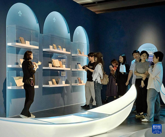 7月3日,工作人員(左)向參觀者講解一組馬可·波羅相關(guān)文獻(xiàn)資料的展品。