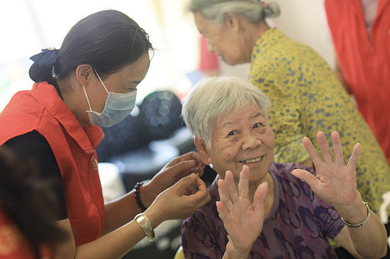 黃雪芳作為志愿者關(guān)愛銀發(fā)長者健康,參加耳穴義診活動(dòng)