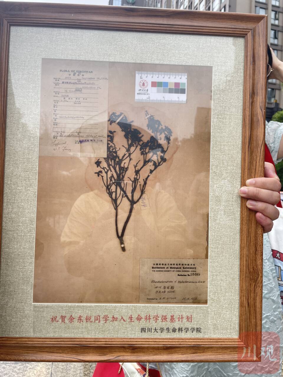 在錄取通知書(shū)抵達(dá)現(xiàn)場(chǎng),四川大學(xué)的老師們給余東銳帶來(lái)了學(xué)校準(zhǔn)備的大禮包,其中包括一份四川大學(xué)生命科學(xué)學(xué)院精心準(zhǔn)備的百年前的毛蕊杜鵑植物標(biāo)本復(fù)印件。同時(shí),四川大學(xué)全球校友創(chuàng)業(yè)家聯(lián)合會(huì)四川聯(lián)合會(huì)(以下簡(jiǎn)稱“四川創(chuàng)聯(lián)”)在得知余東銳的家庭情況后,決定資助他繳納四年的學(xué)費(fèi),“得知消息后,我們就在四川創(chuàng)聯(lián)群里征集,幾個(gè)小時(shí)就籌齊了小余同學(xué)4年26000元的學(xué)費(fèi)。”四川創(chuàng)聯(lián)會(huì)長(zhǎng)彭旭東介紹。