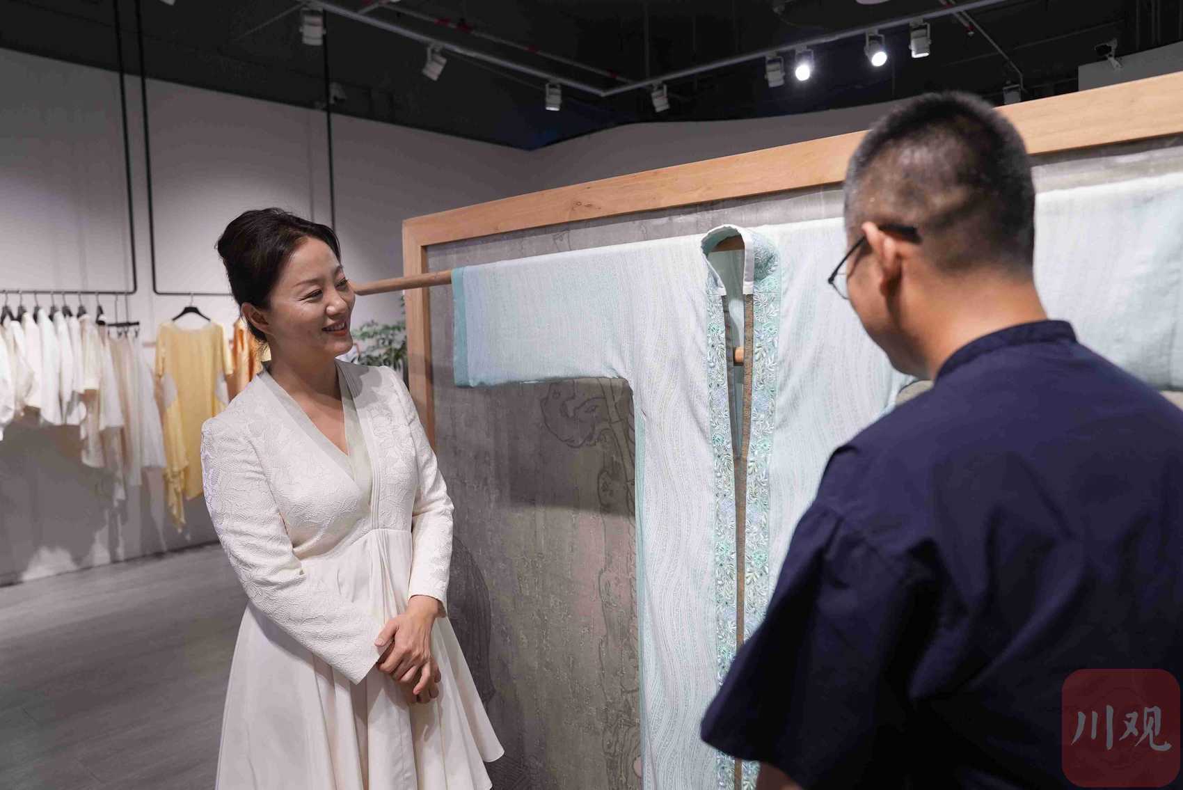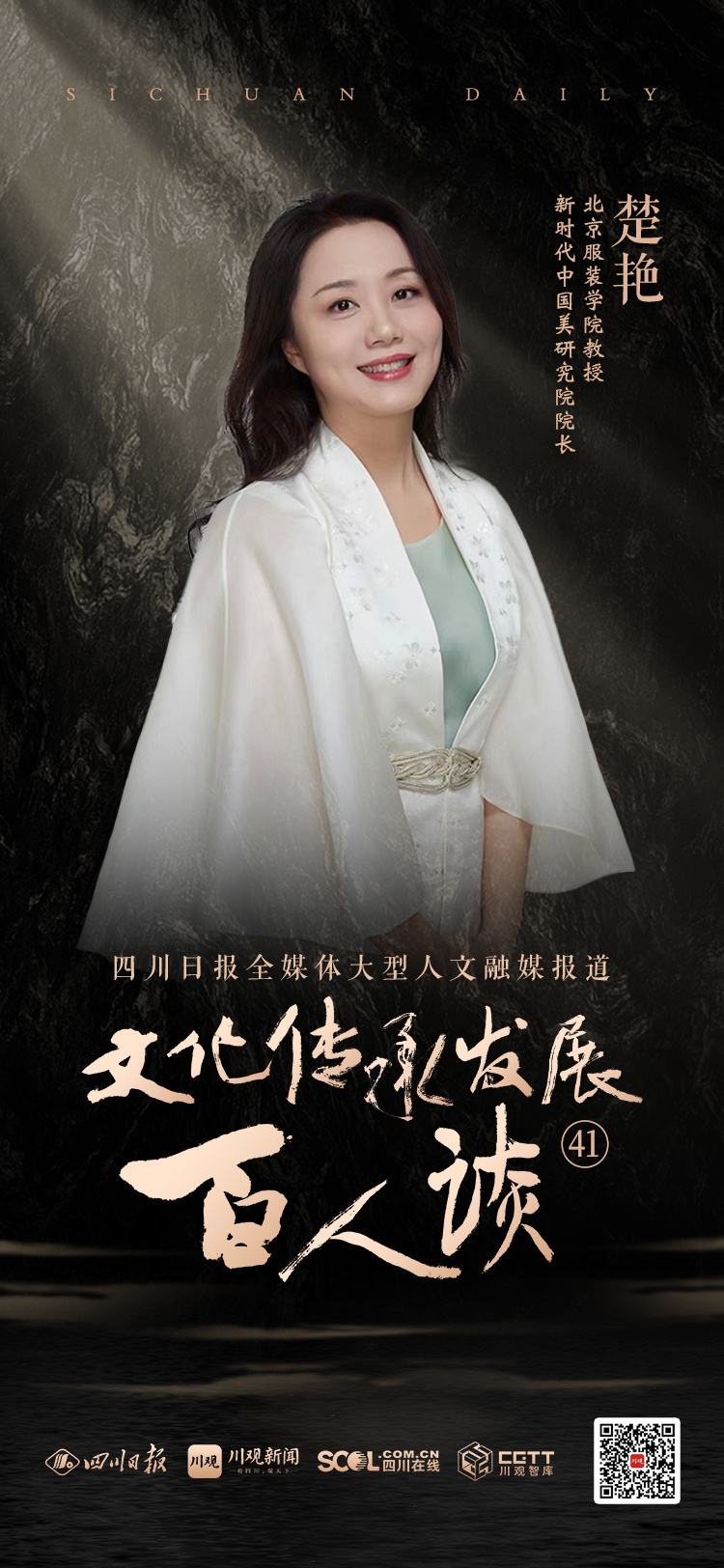 接受四川日報全媒體“文化傳承發(fā)展百人談”大型人文融媒報道記者專訪時,楚艷身穿她自己的原創(chuàng)服裝,得體大方的設計、溫潤內斂的色彩,與身后源于宋代的青綠背景相得益彰。“從業(yè)20多年來,我們一直有個夢想,就是通過服裝這一載體,將中國色、中國形、中國紋,用豐富的手法和設計語言表現出來,向世界展示東方氣韻與中華之美。”楚艷說,這既是我們對中華優(yōu)秀傳統(tǒng)文化的自信與傳承,也是我們對于當下文化的創(chuàng)新與表達。