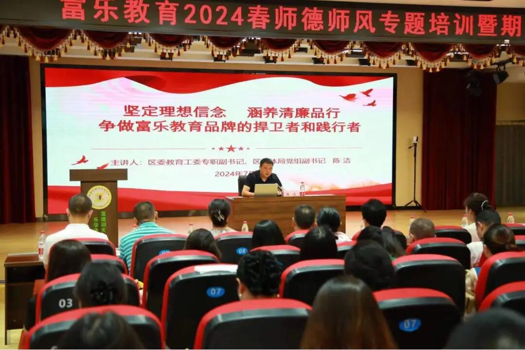 本次專題培訓(xùn)特別邀請(qǐng)了區(qū)委教育工委專職副書記、區(qū)教體局黨組副書記陳潔作主題講座。陳潔作了題為《堅(jiān)定理想信念 涵養(yǎng)清廉品行——爭(zhēng)做富樂教育品牌的捍衛(wèi)者和踐行者》的專題講座。陳潔的講座從堅(jiān)定不移的推進(jìn)新時(shí)代黨的政治建設(shè)、堅(jiān)定不移的強(qiáng)化新時(shí)代黨的紀(jì)律建設(shè)和準(zhǔn)確認(rèn)識(shí)和把握新形勢(shì)下社會(huì)的發(fā)展變化三個(gè)方面,深入剖析了新形勢(shì)下人人都應(yīng)做到三要:要有獨(dú)立的思考、要有家國(guó)情懷和要有感人之心。他結(jié)合當(dāng)前教育新形式,深入剖析了師德師風(fēng)建設(shè)的內(nèi)涵、重要性和實(shí)踐路徑。同時(shí),他指出作為教育工作的主體,教師必須要堅(jiān)守教育初心、清廉從教,不斷提升專業(yè)素養(yǎng)和道德水平,做學(xué)生健康成長(zhǎng)的引路人。