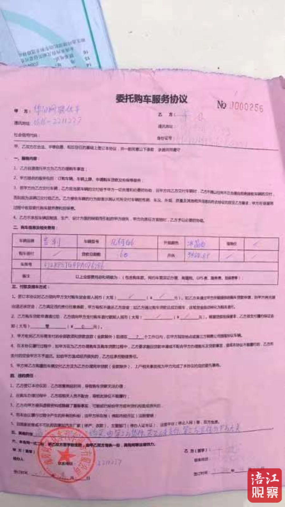 4月27日,梁波和該公司簽訂了《委托購(gòu)車服務(wù)協(xié)議》,其中“購(gòu)車信息和相關(guān)費(fèi)用”一欄,只有“貸款總期數(shù)60”和“月供3488.89元”,指導(dǎo)價(jià)和購(gòu)車首付都劃了“/”。
