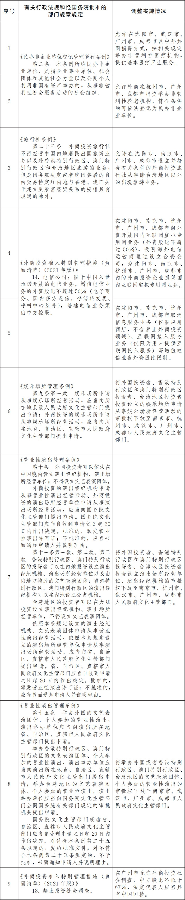 一、按照《國務(wù)院關(guān)于同意在沈陽等6個(gè)城市開展服務(wù)業(yè)擴(kuò)大開放綜合試點(diǎn)的批復(fù)》(國函〔2022〕135號(hào)),同意自即日起,在沈陽市、南京市、杭州市、武漢市、廣州市、成都市等6個(gè)服務(wù)業(yè)擴(kuò)大開放綜合試點(diǎn)城市暫時(shí)調(diào)整實(shí)施《民辦非企業(yè)單位登記管理暫行條例》、《旅行社條例》、《娛樂場所管理?xiàng)l例》、《營業(yè)性演出管理?xiàng)l例》、《外商投資準(zhǔn)入特別管理措施(負(fù)面清單)(2021年版)》的有關(guān)規(guī)定(目錄附后)。