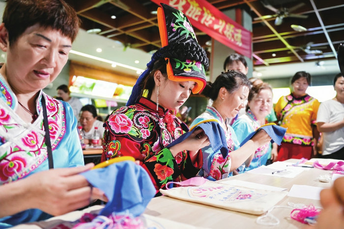 活動(dòng)中,1000名羌繡學(xué)員參觀了北川非遺文化展覽?;顒?dòng)特邀北川羌繡省級(jí)傳承人陳云珍和民族高定服飾設(shè)計(jì)師李梓潼,為學(xué)員進(jìn)行羌繡技能培訓(xùn),培養(yǎng)新時(shí)代羌繡技能人才,助力鄉(xiāng)村振興。