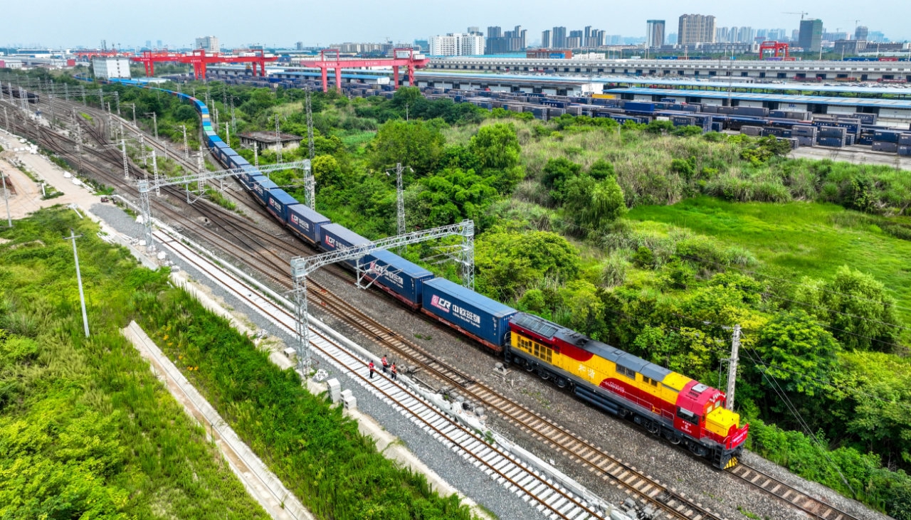 一列中歐班列(成渝)從成都國(guó)際鐵路港開(kāi)出 成都市青白江區(qū)委宣傳部供圖