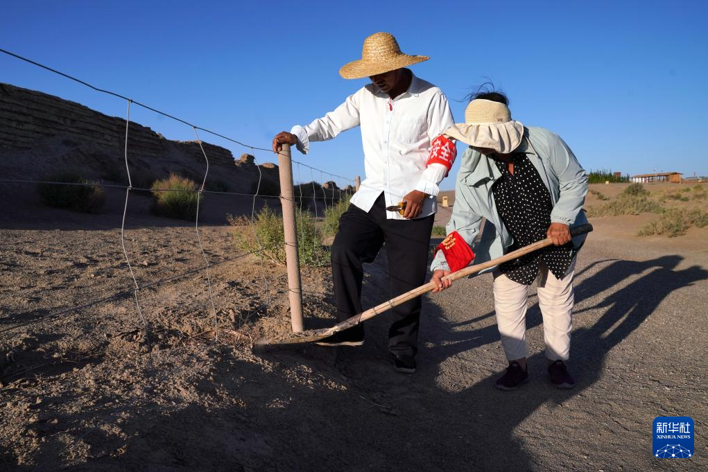 7月16日,張吉全和聞春瑜夫婦沿著漢長(zhǎng)城巡護(hù)時(shí)加固防護(hù)欄。