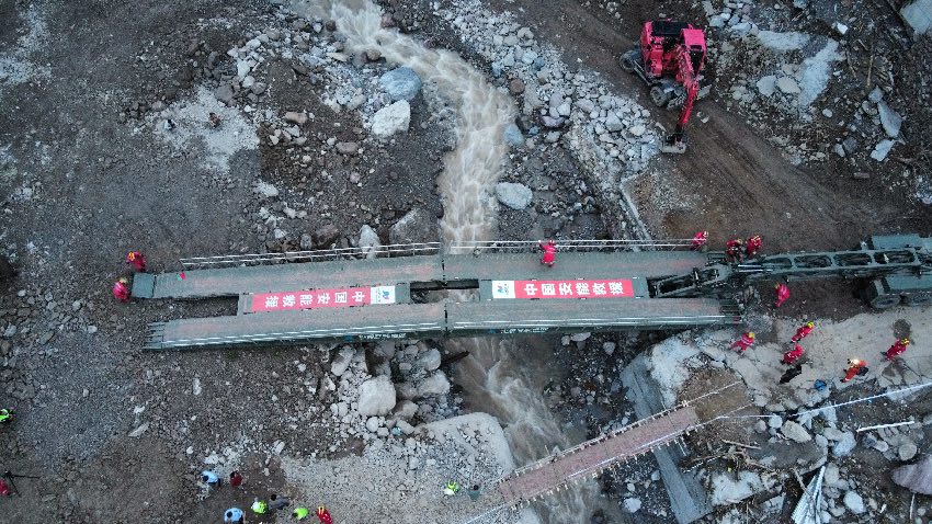 原本的石橋損壞后,救援隊(duì)伍用木板搭了一座臨時(shí)橋。7月21日晚上8點(diǎn)15分,就在受損的豆腐石橋位置,中國安能三局成功架設(shè)起一座應(yīng)急機(jī)械化橋,解決了救援人員和重型機(jī)械通行問題,為后續(xù)人員搜救和應(yīng)急保障提供了有力支撐。接下來,更多的大型機(jī)械將開進(jìn)救援現(xiàn)場,搜救失聯(lián)人員、排危除險(xiǎn)、消殺等工作仍在繼續(xù)。