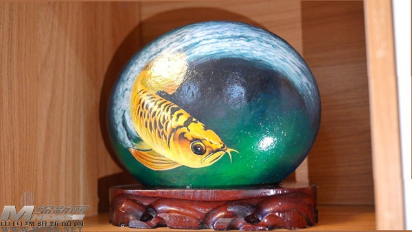 這些多姿多彩的石畫均出自張霞之手,她自幼愛好繪畫。6年前一次郊游,她在涪江河灘拾得幾枚形態(tài)好看的石頭,于是帶回家。閑暇時(shí),張霞把玩這些石頭,靈感油然而生:“何不在石頭上繪畫呢?”