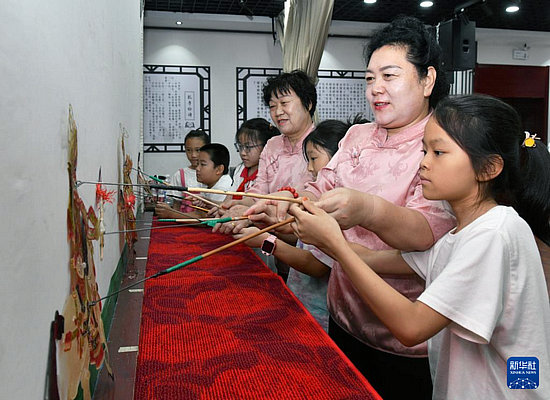 7月26日,在河間市第一實(shí)驗(yàn)小學(xué),皮影戲藝人在指導(dǎo)小學(xué)生學(xué)習(xí)皮影戲。