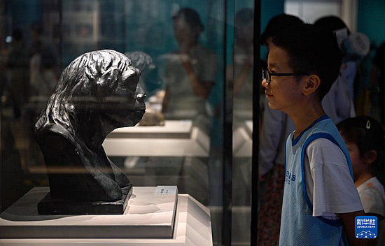 7月30日,一名小朋友在展覽上觀看“北京人”復(fù)原像。