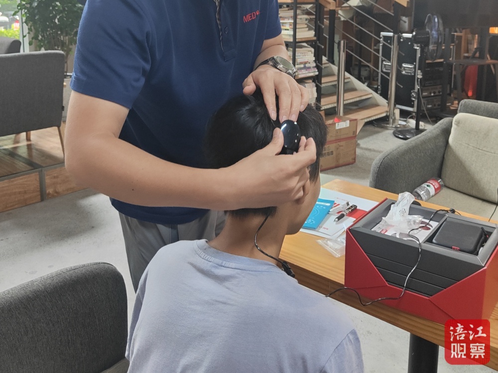 “這款耳蝸是我們最新的產(chǎn)品,不僅操作更為便捷,還實(shí)現(xiàn)了無線充電功能,續(xù)航長達(dá)18小時,音質(zhì)也更加柔和舒適。”黃良威一邊介紹一邊細(xì)心為小峰調(diào)試新耳蝸。