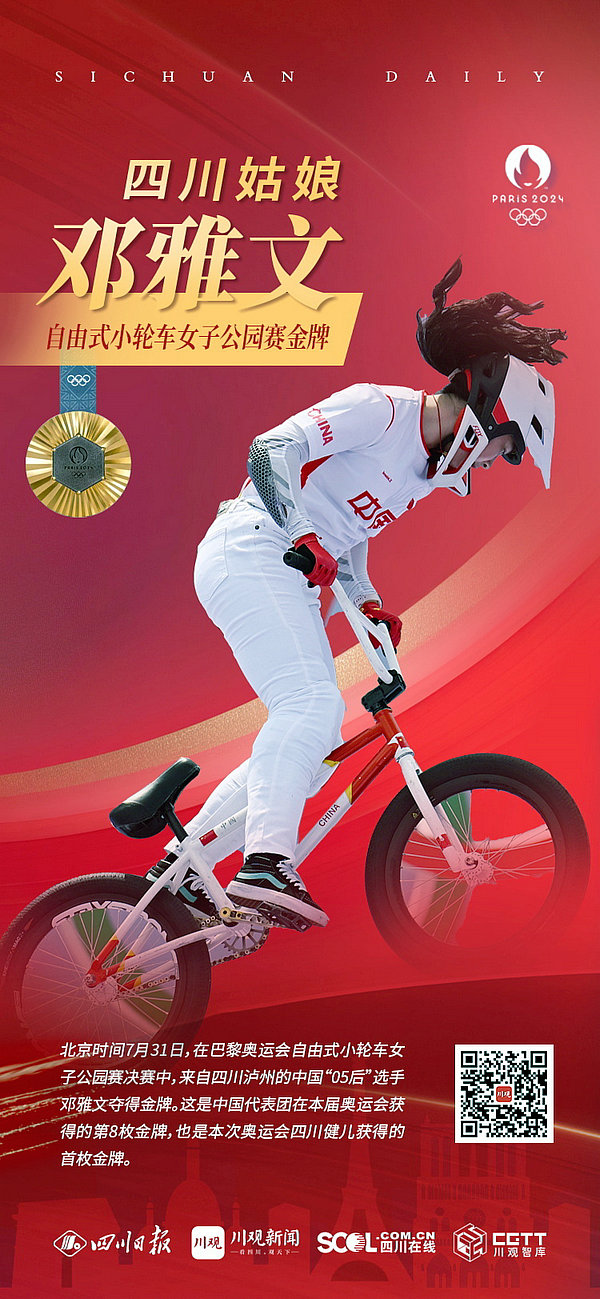 第一次參加奧運會就拿到金牌,鄧雅文做到了。北京時間7月31日,2024年巴黎奧運會自由式小輪車女子公園賽決賽在巴黎協(xié)和廣場拉開戰(zhàn)幕。比賽正值巴黎正午時分,氣溫很高,倒數(shù)第二出發(fā)的四川瀘州的“05后”小將鄧雅文面對諸多歐美高手的圍追堵截,最終以兩輪成績最高分92.6分,拿到金牌,拿到中國自由式小輪車在奧運會上的第一塊金牌。