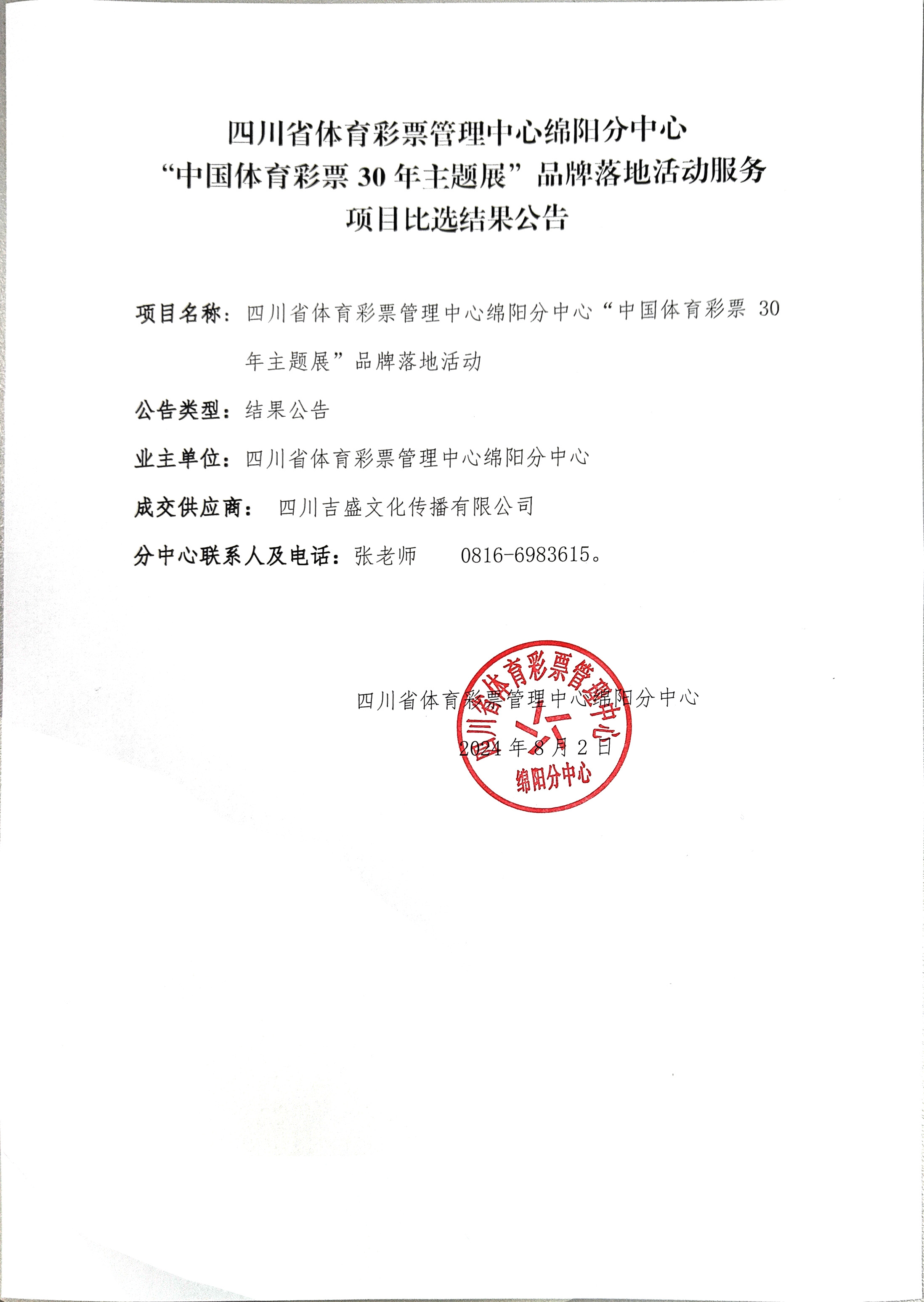 四川省體育彩票管理中心綿陽分中心“中國(guó)體育彩票 30年主題展”品牌落地活動(dòng)服務(wù)項(xiàng)目比選結(jié)果公告