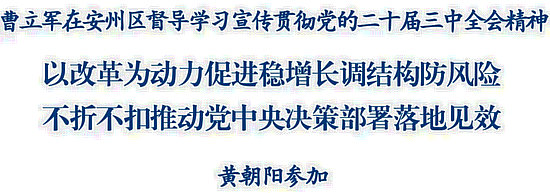 督導(dǎo)期間,曹立軍每到一處都認(rèn)真聽取學(xué)習(xí)宣傳貫徹黨的二十屆三中全會情況介紹,并向基層干部群眾宣講全會精神。他強調(diào),黨的二十屆三中全會是我們黨的歷史上又一個重要里程碑,是進一步全面深化改革、推進中國式現(xiàn)代化的總動員、總部署,意義重大而深遠(yuǎn)。要把學(xué)習(xí)宣傳貫徹全會精神作為當(dāng)前和今后一個時期全市上下的重大政治任務(wù),精心組織學(xué)習(xí)培訓(xùn),廣泛開展宣傳宣講,切實把思想和行動統(tǒng)一到黨中央大政方針和省委決策部署上來。要高質(zhì)量推進國省重點改革任務(wù)落地,精心謀劃一批符合本地實際的改革舉措,注重發(fā)揮經(jīng)濟體制改革的牽引作用,深化鄉(xiāng)鎮(zhèn)抓產(chǎn)業(yè)促推高質(zhì)量發(fā)展激勵試點、綿州農(nóng)房增信貸、“鎮(zhèn)園合一”等系列自主性改革,統(tǒng)籌推進其他各領(lǐng)域改革,把進一步全面深化改革的戰(zhàn)略部署轉(zhuǎn)化為推進現(xiàn)代化建設(shè)的強大力量。要把學(xué)習(xí)貫徹全會精神與做好當(dāng)前工作結(jié)合起來,緊緊把握三季度黃金期、窗口期,加強經(jīng)濟運行調(diào)度,全力以赴做好穩(wěn)投資、強產(chǎn)業(yè)、促消費、擴開放等重點工作,不斷鞏固和增強經(jīng)濟持續(xù)向好態(tài)勢,堅定不移完成全年經(jīng)濟社會發(fā)展目標(biāo)任務(wù),努力為全市發(fā)展大局貢獻更多力量。