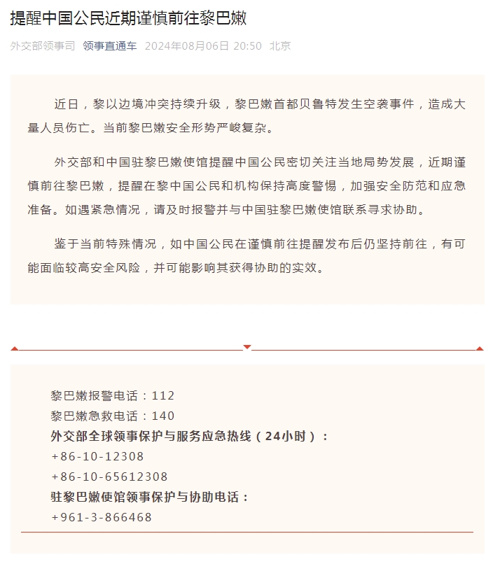 外交部和中國駐黎巴嫩使館提醒中國公民密切關(guān)注當(dāng)?shù)鼐謩莅l(fā)展,近期謹慎前往黎巴嫩,提醒在黎中國公民和機構(gòu)保持高度警惕,加強安全防范和應(yīng)急準(zhǔn)備。如遇緊急情況,請及時報警并與中國駐黎巴嫩使館聯(lián)系尋求協(xié)助。