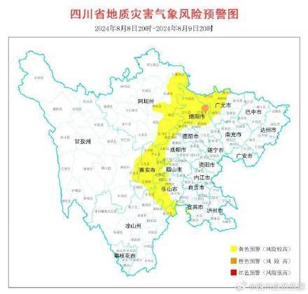 根據四川省氣象臺天氣預報情況,結合四川省地質環(huán)境條件,8月8日20時至8月9日20時,全省地質災害氣象風險預警結果如下: