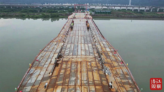位于綿陽市城北片區(qū)的青石路涪江大橋全長約1。4公里,東接游仙區(qū)石馬鎮(zhèn)科學(xué)城大道,西接涪城區(qū)青義鎮(zhèn)綿江路,由中交第二航務(wù)工程局有限公司承建。主橋為梁拱組合鋼橋,重11600余噸,采用三跨連續(xù)變截面鋼箱梁建造,標(biāo)準(zhǔn)梁面寬度42米,最大梁面寬度52米,是目前國內(nèi)最大網(wǎng)狀剛性吊桿三跨拱梁組合體系橋,也是目前國內(nèi)采用頂推施工的最大變截面鋼箱梁拱橋。